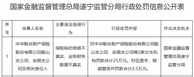 国家金融监督管理总局网站近日公布的遂宁监管分局行政处罚信息公开表显示,中华联合财产保险股份有限公司船山支公司、安居支公司等2家分支机构保险标的信息不真实、业务财务数据不真实。国家金融监督管理总局遂宁监管分局对2家分支机构罚款合计25万元,对伍登宇、程超警告并罚款合计2.5万元。