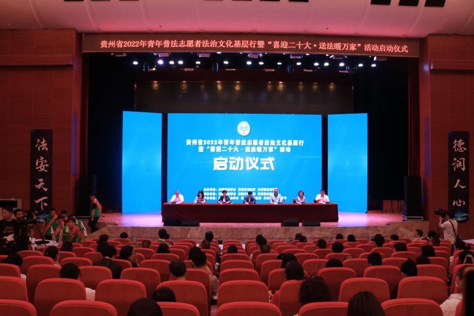 7月20日上午,贵州省2022年青年普法志愿者法治文化基层行暨“喜迎二十大·送法暖万家”活动在贵阳市观山湖区正式启动。此次活动由省法学会、省司法厅、共青团贵州省委主办,贵阳市法学会、市司法局、共青团贵阳市委共同承办。省委政法委副书记刘文新出席活动并讲话,省法学会专职副会长兼秘书长王占霞主持启动仪式。贵阳市委常委、市委政法委书记、市法学会会长彭容江出席活动并致辞。省法学会、省司法厅、团省委和贵阳市、观山湖区相关单位负责同志,部分会员代表、青年普法志愿者代表、社区群众代表约100余人参加了活动启动仪式。