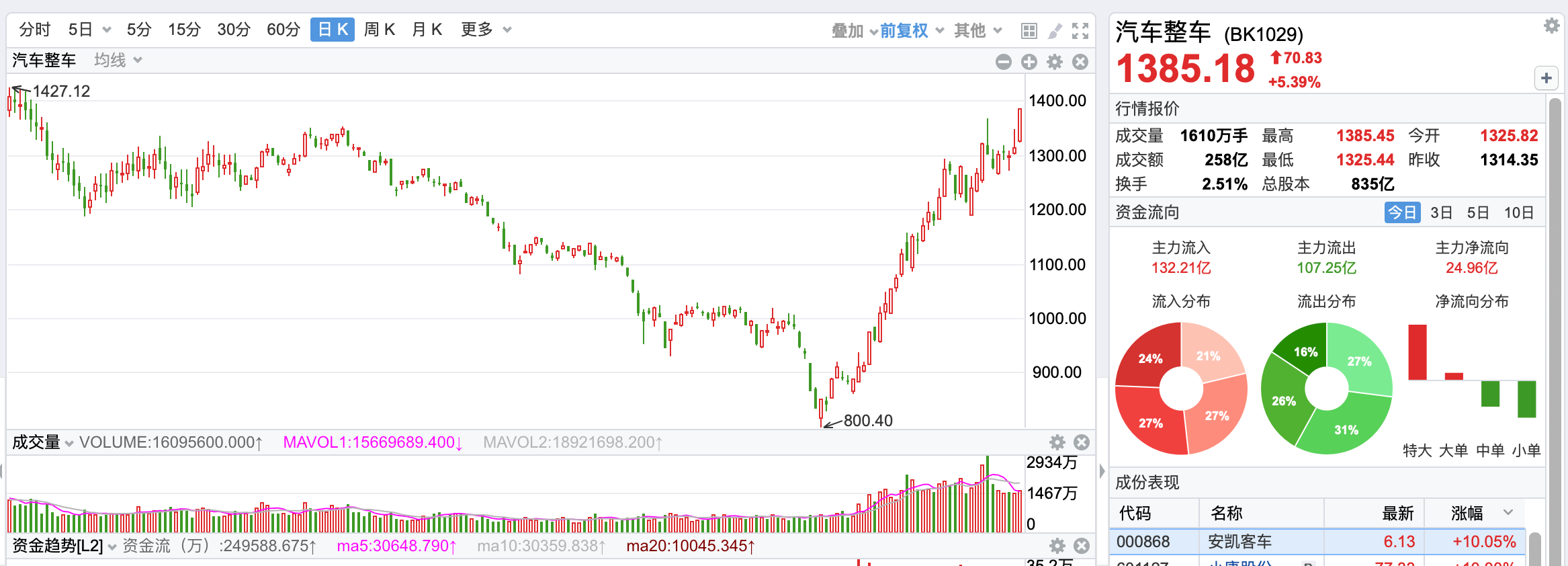 受上述政策影响,截至6月23日午间休盘,汽车整车、汽车零部件、新能源汽车板块等指数大涨,不少个股掀涨停潮。其中,汽车整车指数涨5.39%至1385.18,安凯客车、小康股份、亚星客车涨停。从今年4月底以来,该指数已经反弹超60%。其中,小康股份、长安汽车等个股实现了翻倍行情。